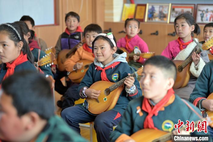 中新社記者近日探訪瑪曲縣寄宿制藏族小學彈唱社團活動,未進教室,已聽到室內(nèi)傳出的歡快琴聲和笑聲。