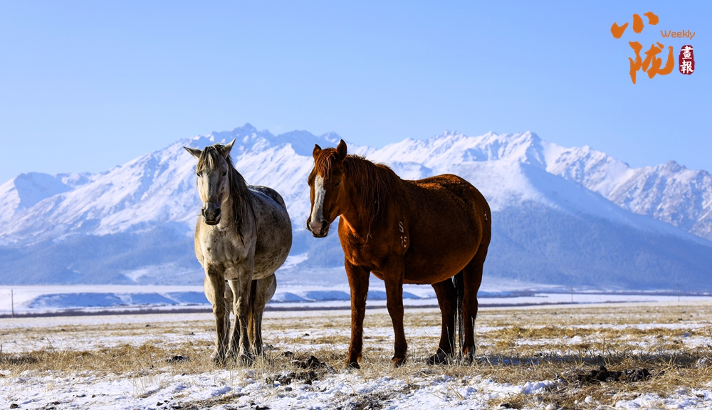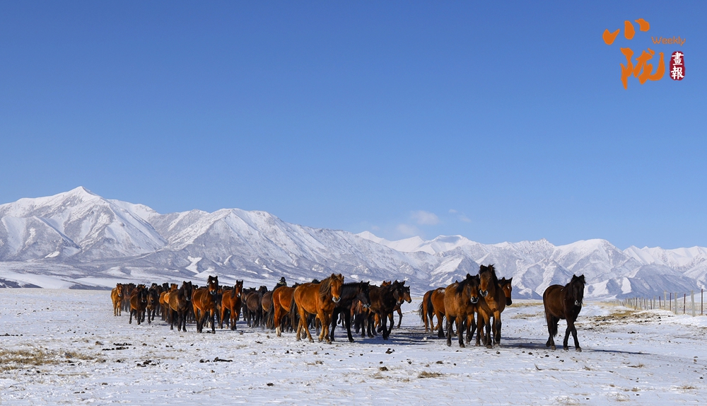 一場春雪后,山丹馬場天空湛藍,祁連山巍巍壯觀。成群的駿馬在這片廣袤無垠的草原上或低頭吃草,或奔跑嬉戲,成為雪地里一道靚麗的風景。