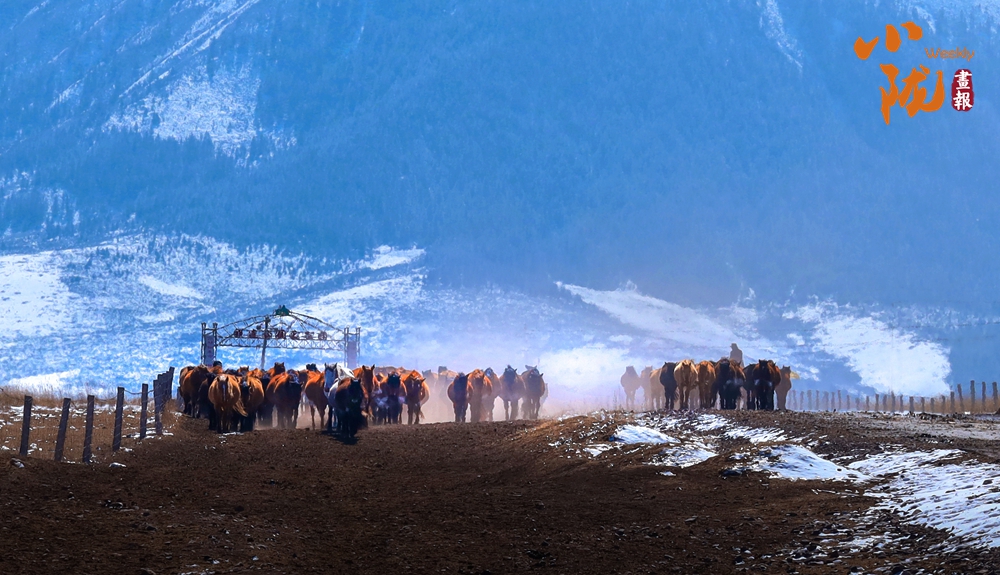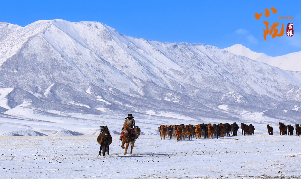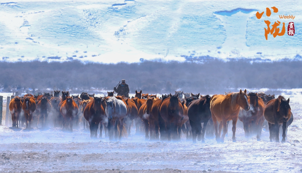 牧民策馬揚鞭,驅(qū)趕著馬群在積雪中飛馳。駿馬矯健的身姿如靈動音符,奏響春日里激昂旋律。
