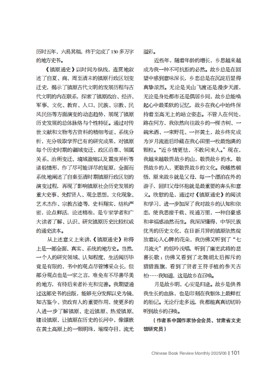 近些年,隨著年齡的增長(zhǎng),鄉(xiāng)思越來(lái)越成為我一種不可抗拒的必然。故鄉(xiāng)總是在回望中感到意味深長(zhǎng),鄉(xiāng)戀總是在沉淀后顯得真摯濃烈。無(wú)論是關(guān)山飛渡還是漫步天涯,無(wú)論是身處都市還是偶居鄉(xiāng)間,故鄉(xiāng)總能喚起心中最柔軟的記憶,故鄉(xiāng)在我心中始終保持著至高無(wú)上的站立姿態(tài)。不管人在何處,路在何方,我依然向往故鄉(xiāng)的一棵杏樹(shù)、一碗米酒、一束野花、一抔黃土,故鄉(xiāng)終究成為歲月流逝后珍藏在我心田里一枚最飽滿(mǎn)的顆粒。“近鄉(xiāng)情更怯,不敢問(wèn)來(lái)人。”現(xiàn)在,我越來(lái)越敬畏故鄉(xiāng)的山,敬畏故鄉(xiāng)的水,敬畏故鄉(xiāng)的人,更敬畏故鄉(xiāng)的文化。我幡然頓悟,原來(lái)故鄉(xiāng)就是父母,每一個(gè)漂泊在外的游子,回歸父母懷抱就是最重要的奔頭和意義。欣慰的是,通過(guò)對(duì)《鎮(zhèn)原通史》的閱讀和學(xué)習(xí),進(jìn)一步加深了我對(duì)故鄉(xiāng)的認(rèn)知和依戀,使我思接千載、視通萬(wàn)里,一種自豪感和幸福感油然而生。我深深懂得,中華民族優(yōu)秀的歷史文化,在日新月異的鎮(zhèn)原依然綻放著沁人心脾的花朵,我仿佛又聽(tīng)到了“七月流火”的低吟淺唱,聽(tīng)到了廉吏武將的悲喜長(zhǎng)歌 ;仿佛又看到了北魏胡太后揮斥的獵獵旌旗,看到了賢者王符手植的參天古柏……我知道,這是故鄉(xiāng)在召喚。月是故鄉(xiāng)明,心安是歸途。故鄉(xiāng)是供養(yǎng)我生長(zhǎng)的血脈,也是印刻在我軀體上最鮮紅的胎記。無(wú)論行走多遠(yuǎn),我都能真真切切聆聽(tīng)到故鄉(xiāng)的召喚。