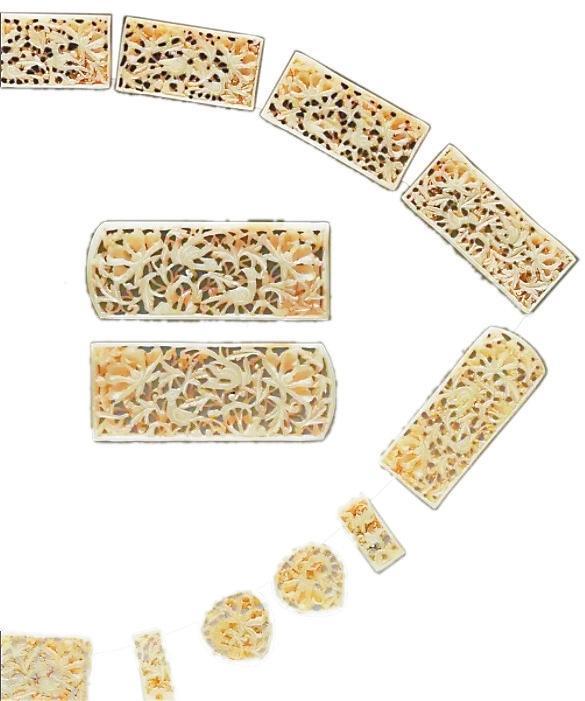 排方長(zhǎng)5.1厘—7.6厘米、寬3.3厘米、厚0.7厘米,1955年蘭州市上西園明墓出土。青灰色和田玉鏤雕而成,包括三臺(tái)1、弼輔4、圓桃4、鉈尾2、排方7,均透雕牡丹花枝,邊緣有界欄。其中四塊較大的長(zhǎng)條排方,雕飾最為精美,于繁花密葉間配置一對(duì)雉雞,構(gòu)圖繁縟,富于變化,顯示出工匠高超的技術(shù)造詣。