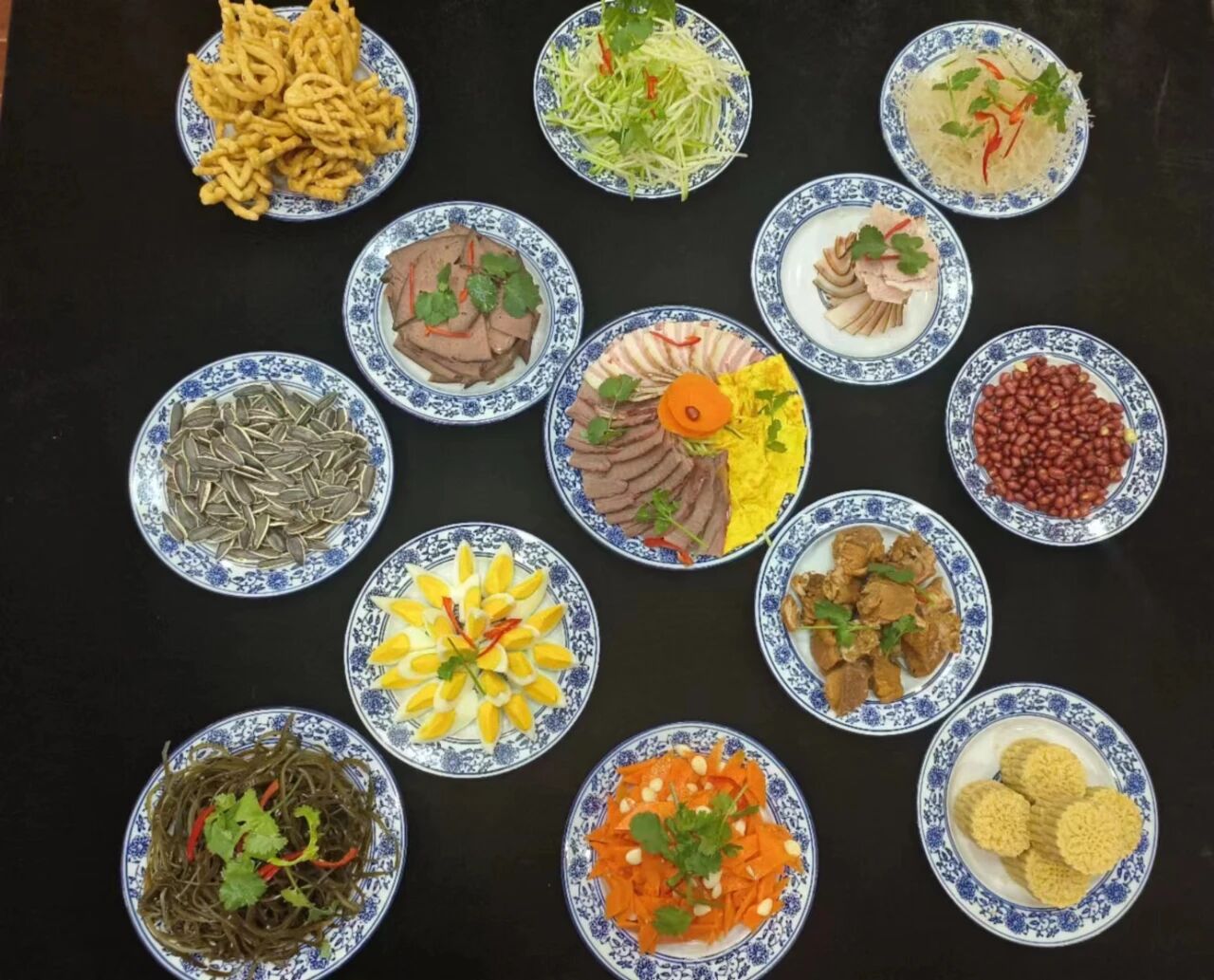 以常見的“十三花”為例,“十三花”,即十二個佐酒涼菜,加一旋菜全盤。整體具有太陽花或旋轉八卦意象,遂美稱為“花”。