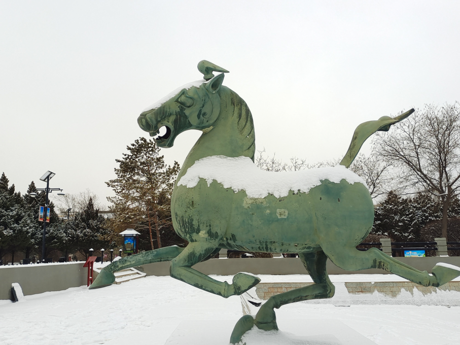 厚德載物的包容精神。特殊的地理環(huán)境,造就了涼州馬文化兼容并蓄、厚德載物的精神特質(zhì)。涼州大馬是中原馬、西域馬與蒙古馬雜交改良的產(chǎn)物,既保留了蒙古馬的耐力,又兼具西域馬的速度,這種“取長補(bǔ)短”的改良過程,本身就是包容精神的具體體現(xiàn)。“馬踏飛燕”作為東西方文化融合的藝術(shù)結(jié)晶,其形象既源于中原的“龍馬精神”,又吸納了西域“翼馬”的神話元素,成為兼容并蓄精神的具象化表達(dá)。它的鑄造工藝同樣展現(xiàn)出包容的特質(zhì),既采用了中原傳統(tǒng)的陶范鑄接法,又融入了西域藝術(shù)的浪漫主義風(fēng)格,寫實(shí)與想象完美結(jié)合,形成了形神兼?zhèn)洹忭嵣鷦拥乃囆g(shù)效果。