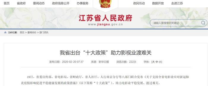 2月19日,江蘇省八部門聯(lián)合發(fā)布《關(guān)于支持全省電影業(yè)應(yīng)對新冠肺炎疫情影響促進(jìn)平穩(wěn)健康發(fā)展的政策措施》,即“影十條”,從落實(shí)稅收優(yōu)惠政策、加強(qiáng)財(cái)政支持力度、加大信貸投放、減免房租等十方面幫助電影業(yè)。