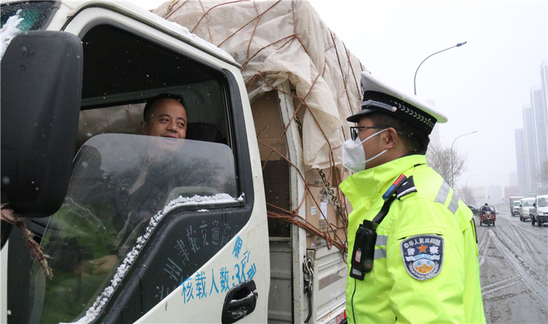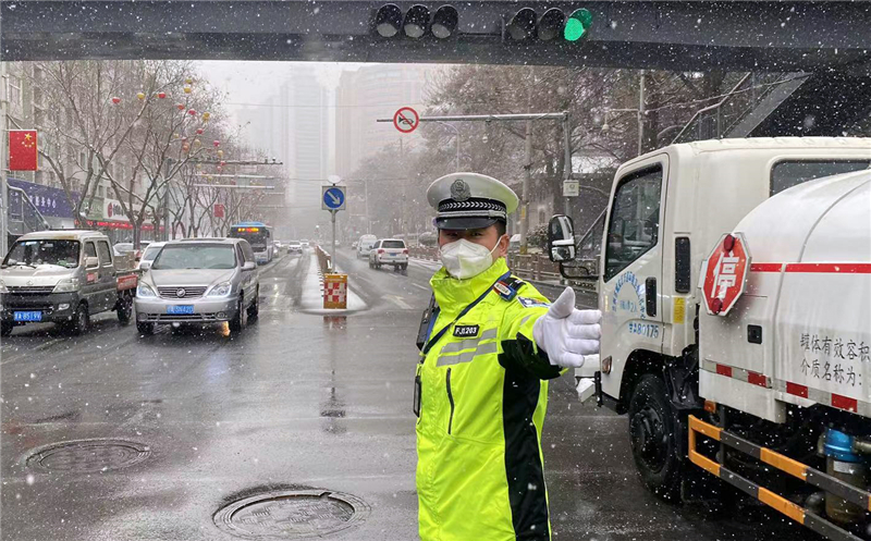 大隊領導實地查看道路通行情況,及時調(diào)整勤務模式和警力部署,確保降雪天氣各項安全“防控”措施落實到位。民輔警全員上路,強化重點路段巡邏管控和主要路口值守,對不具備通行條件車輛進行勸返或提示繞行。通過鳴笛、喊話、閃爍警燈等措施,提醒駕駛員裝配防滑鏈,減緩車速、保持安全車距、注意觀察路面通行情況,引導車輛和行人安全有序通行。