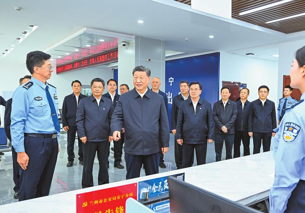 9月10日至13日,中共中央總書(shū)記、國(guó)家主席、中央軍委主席習(xí)近平在甘肅考察。這是11日下午,習(xí)近平在蘭州市公安局安寧分局劉家堡派出所考察。新華社記者燕雁