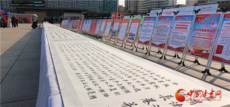 活動現(xiàn)場,省委宣傳部、省委政法委、省法院、省檢察院等20余家單位結(jié)合行業(yè)實際,宣傳憲法,普及法律知識,為群眾提供法律咨詢。為了豐富普法載體,讓群眾在互動參與中學(xué)習(xí)法律知識,活動展出了由定西市通渭縣司法局聯(lián)合書法家、師生群體、法官、檢察官、公安民警等各行各業(yè)工作人員創(chuàng)作的百米《書·法》長卷,鐫刻法治精神,書寫法律法規(guī)?,F(xiàn)場還表演了精彩的文藝節(jié)目。