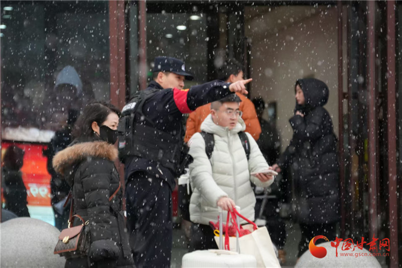 春運期間,天水普降大雪,天水南站派出所民警加強警力部署,在站前廣場開展為民服務