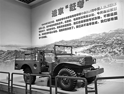 在紀念館第一部分進京“趕考”第二單元展廳內(nèi),一輛軍用吉普車靜靜地陳列于此,這是毛澤東從西柏坡進京時乘坐的同款吉普車。該車與普通吉普車相比車身較長,空間寬敞,駕駛員一側(cè)放置有備胎,沒有車門,唯獨副駕駛位置有個豁口;發(fā)動機蓋為側(cè)開,形制十分特別。