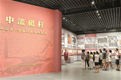 走進(jìn)中國(guó)共產(chǎn)黨歷史展覽館四層專題展廳,首先看到一面紅底金字的大型展板,形似一本翻開的書本。“書”的正面,“中流砥柱”四個(gè)大字在燈光照射下閃閃發(fā)亮,下方緊跟一行小字“中國(guó)共產(chǎn)黨抗日戰(zhàn)爭(zhēng)檔案展”;側(cè)面,金色字體展示著毛澤東同志《中國(guó)共產(chǎn)黨在民族戰(zhàn)爭(zhēng)中的地位》里的內(nèi)容:“每一個(gè)共產(chǎn)黨員必須發(fā)揮其全部的積極性,英勇堅(jiān)決地走上民族解放戰(zhàn)爭(zhēng)的戰(zhàn)場(chǎng),拿槍口瞄準(zhǔn)日本侵略者。”
