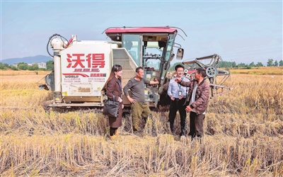 糧食安全是“國(guó)之大者”。安徽省含山縣紀(jì)委監(jiān)委聚焦高標(biāo)準(zhǔn)農(nóng)田建設(shè)管理中的突出問(wèn)題開(kāi)展一線走訪,推動(dòng)“糧田”變“良田”。圖為該縣紀(jì)檢監(jiān)察干部在環(huán)峰鎮(zhèn)城北村水稻收割現(xiàn)場(chǎng)了解相關(guān)情況。歐宗濤 攝