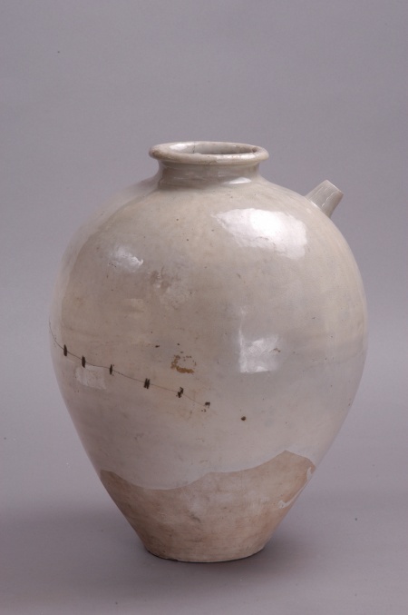 唐代,移交,初出土于武威弘化公主墓。高40.5厘米,口徑12厘米,底徑12.3厘米。圓唇,小口外卷沿,束頸,圓肩,下腹斜收,平底。肩部斜置一管狀短流。胎表有白色化妝土,通體施白釉,釉不及底,釉面光潤(rùn)且有細(xì)碎冰裂紋。器身無(wú)花紋,造型規(guī)整、飽滿(mǎn),具有鮮明的唐代風(fēng)格。