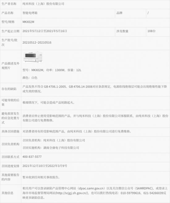據(jù)上海市市場(chǎng)監(jiān)督管理局網(wǎng)站2021年12月9日消息,純米科技(上海)股份有限公司召回部分智能電烤箱。