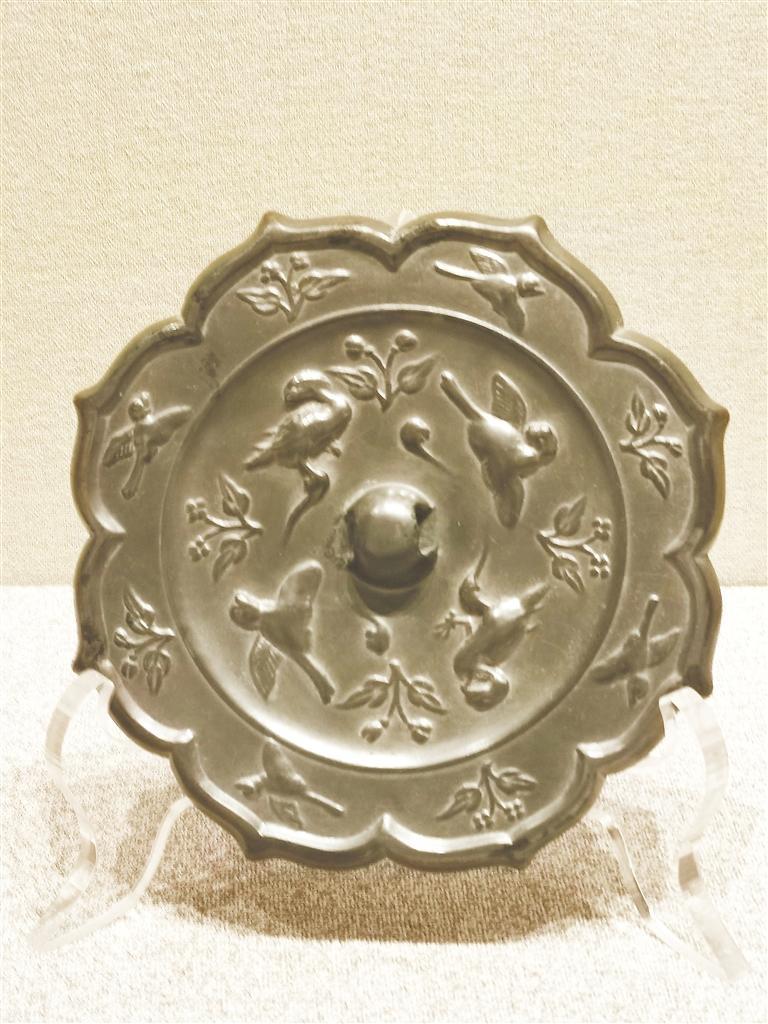 平?jīng)鍪胁┪镳^藏,唐代,八瓣菱花形,內(nèi)切圓形,圓鈕。上下左右交隔對(duì)稱分布四只鸞鳥(niǎo)、四枝二葉二苞折枝花。