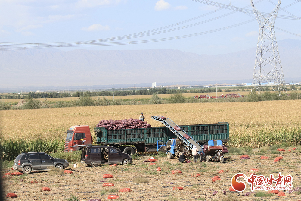 腳下有稻田,耳邊有水聲。帶著泥土的洋蔥整跺碼放,依次裝進卡車里,鮮綠的高原夏菜在田間地頭收割后送進發(fā)往南方的冷柜,百畝靑儲玉米經(jīng)過壓縮打包等待進入牧場糧倉……祁連山下秋收正在火熱進行中。
