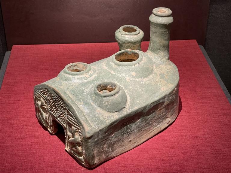 綠釉陶灶高21厘米,長28厘米,寬19.5厘米,為蘭州市博物館館藏二級文物。陶灶反映了當時人們的生產(chǎn)生活和思想觀念。漢代之所以流行陶灶模型,主要原因有二,一是兩漢時期大土地所有制經(jīng)濟的盛行使得豪門貴族占據(jù)社會主要地位,而“事死如事生”的觀念促使他們隨葬大量明器,以求在陰間繼續(xù)享受榮華富貴。二是由于漢代的祭灶思想助推了陶灶的流行。