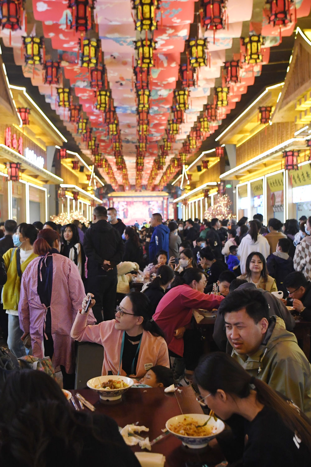 ↑3月25日,游客在“黃河食渡文化夜市”休閑游覽。