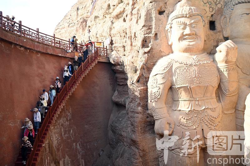 4月16日,甘肅省武威市涼州區(qū),學生在天梯山石窟參觀研學。