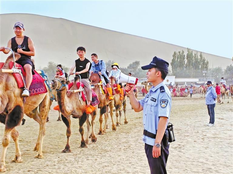 面對隨之而來的社會治安防控壓力,敦煌公安立足旅游特色,結合夏季治安打擊整治行動,精準布警、精細管控、精致服務,時刻踐行“民警就是導游,隊伍就是風景,管理就是服務,執(zhí)法就是守護”的敦煌旅游警務理念,用“5A”警務服務“5A”景區(qū)。