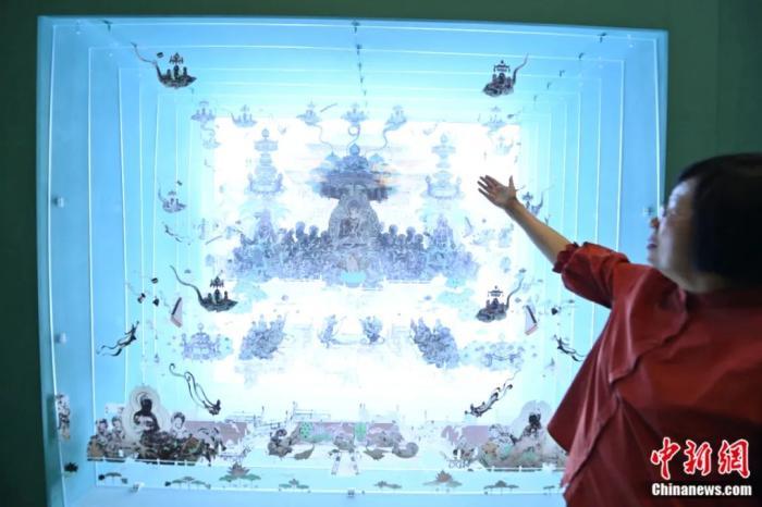 2023年7月14日,孫毅華向中新社記者介紹敦煌壁畫中的建筑形象。李亞龍 攝