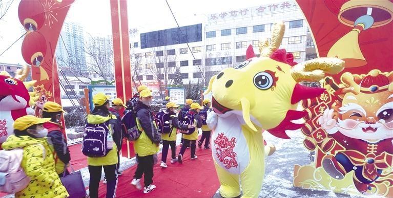 當(dāng)日上午7時(shí)許,記者在蘭州市東郊學(xué)??吹剑iT內(nèi)兩邊擺放著兩條由數(shù)百個(gè)氣球組成的長龍。高年級(jí)段和低年級(jí)段的學(xué)生要穿越寫著“龍騰虎躍,前程似錦”的龍門,方可進(jìn)入教室。同時(shí),兩邊的老師,給每一位到校的學(xué)生發(fā)放小禮物。記者注意到,每個(gè)孩子都領(lǐng)到了一個(gè)小盲盒,里面裝著不同的文具。孩子們高興地?fù)]舞著手中的盲盒,展示新春的快樂。