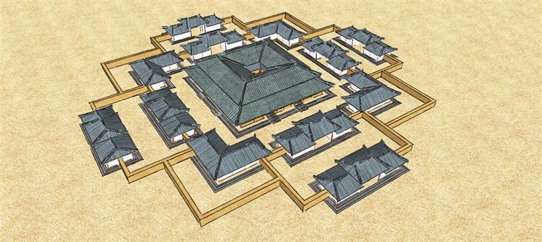 在中心夯土臺(tái)基四邊外約6.3米處平行分布有長(zhǎng)方形附屬建筑,四角分布有曲尺形附屬建筑,對(duì)應(yīng)位置的附屬建筑結(jié)構(gòu)完全相同。長(zhǎng)方形附屬建筑周圍有鵝卵石鋪就的散水環(huán)繞,其內(nèi)有兩個(gè)相對(duì)的方形土臺(tái),邊緣有柱洞,土臺(tái)外端中部連接夯土矮墻延伸至曲尺形建筑。四角曲尺形附屬建筑周圍亦有散水環(huán)繞,臺(tái)基邊緣有柱洞,曲尺形六邊各有一級(jí)空心磚踏步。臺(tái)基上有若干規(guī)律分布的扁平狀青石,推測(cè)應(yīng)為室內(nèi)立柱的礎(chǔ)石。曲尺形建筑的功能應(yīng)該是連接兩邊的長(zhǎng)方形建筑,同時(shí)還要兼顧外圍次一級(jí)附屬建筑的連接。各建筑散水周圍均鋪設(shè)回紋地磚,各臺(tái)基周邊散落著瓦礫堆積。