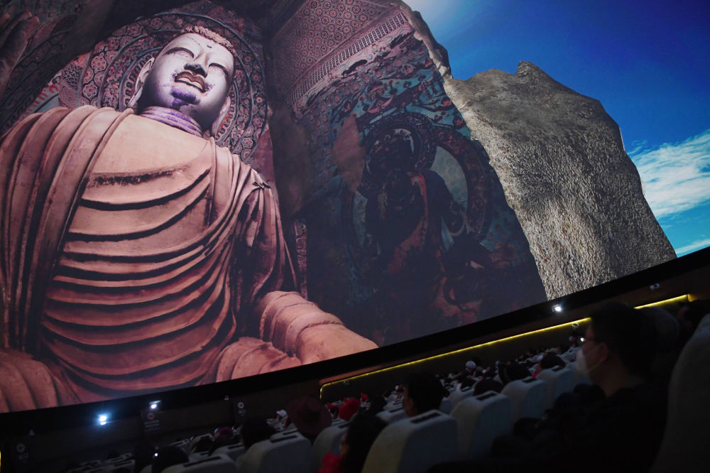 游客在莫高窟數字展示中心觀看球幕電影《夢幻佛宮》。記者 陳斌 攝
