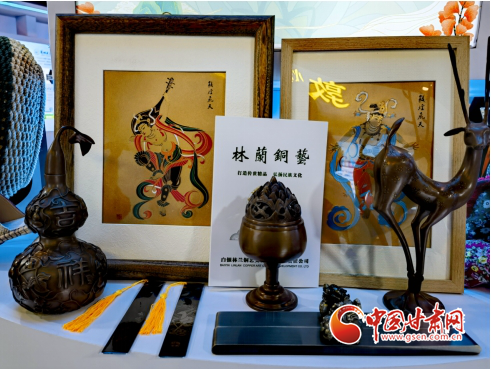 在甘肅館內(nèi)的林蘭銅藝展區(qū),白銀林蘭銅藝文化發(fā)展有限公司負(fù)責(zé)人馬艷萍一邊向觀展賓客介紹自己的產(chǎn)品,一邊向大家推介自己的家鄉(xiāng)—甘肅省白銀市。