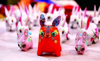 慶陽香包兔元素擺件。 盤小美攝