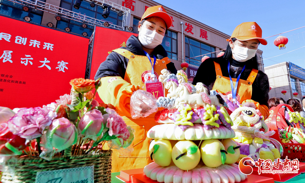 3月5日,臨澤縣金澤廣場美食創(chuàng)意展示大賽現(xiàn)場,農(nóng)家巧廚娘在展示“八駿風馳”特色花饃。