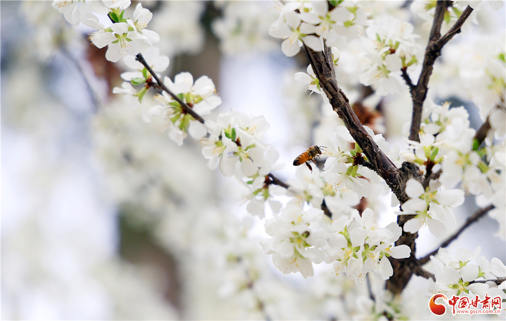 一只蜜蜂停駐花間,振翅采蜜,在純白的花海中增添了靈動生機。各類春花次第開放,白的素雅、粉的嬌嫩、紅的熱烈,為市民獻(xiàn)上一場春日視覺盛宴。