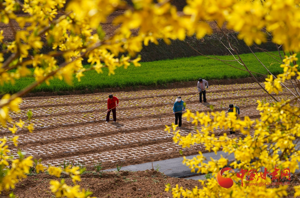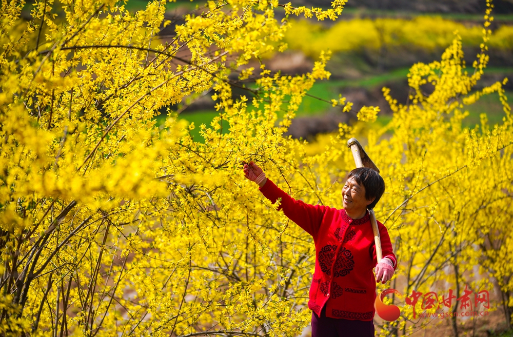 金黃連翹綴滿枝頭,農(nóng)人肩扛農(nóng)具穿行其間,輕觸花枝