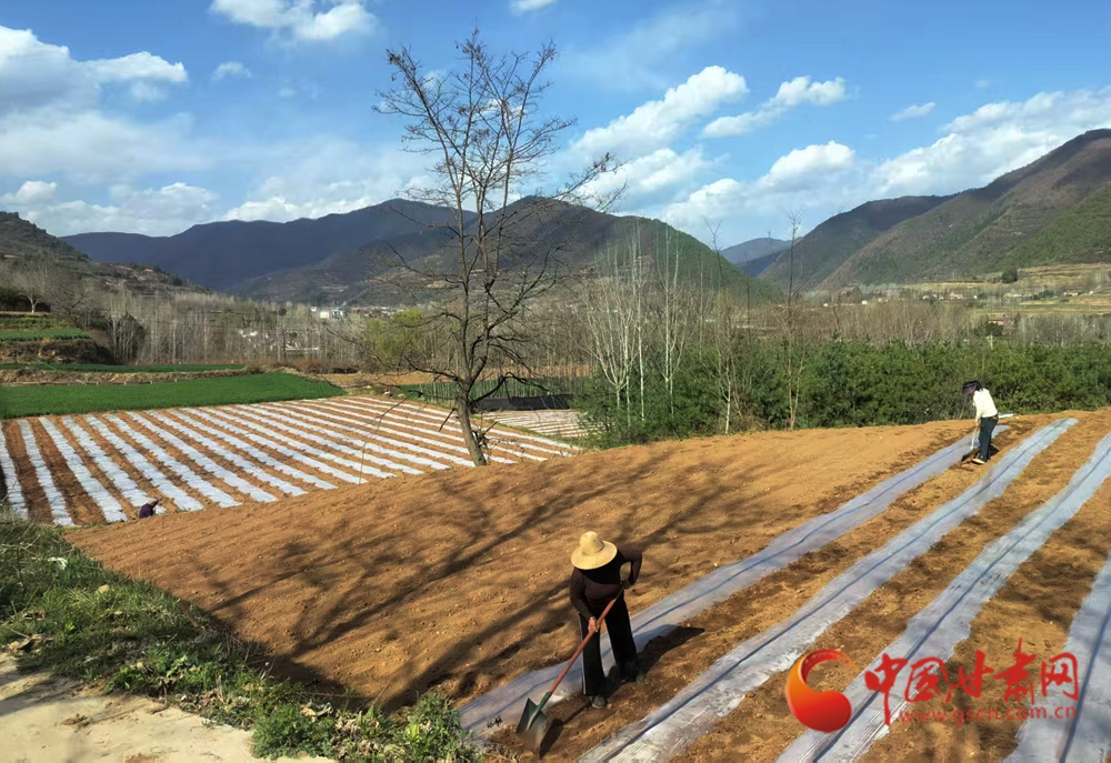 春日暖陽下,農(nóng)人在田壟間忙碌勞作,覆膜、翻土,將希望播撒進松軟泥土