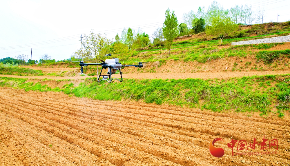 植保無人機在翻耕后的田壟上空作業(yè),高效完成播種前的田間準備