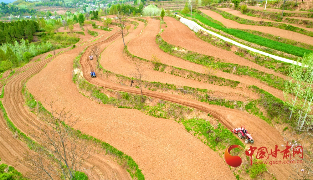 梯田里農(nóng)機穿梭,與田埂新綠相映,奏響春耕序曲