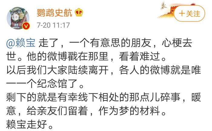 “以后我們大家陸續(xù)離開,各人的微博就是唯一一個紀念館了。剩下的就是有幸線下相處的那點兒碎事,暖意,給親友們留著,作為夢的材料。賴寶走好。”史航寫道。?