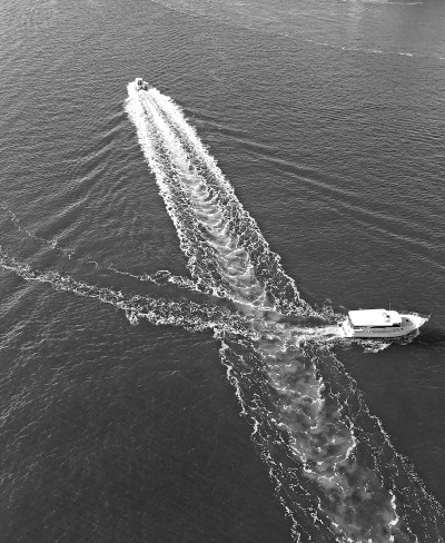 在這張照片里你看見(jiàn)了,天氣晴朗,海水蔚藍(lán),兩船交叉駛過(guò),畫出如此美麗的浪花。這兩艘游船并不是匆匆過(guò)客,而是相約作一次表演,海域內(nèi)洋溢著歡樂(lè)的氣氛。
