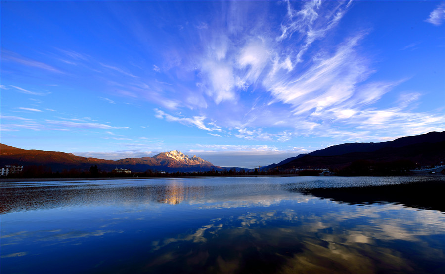 我是被亮光驚醒的。我和很多水從象山腳下的黑龍?zhí)睹俺鰜怼9具艘宦暦纤???匆姾芏嗖煌拥娜?。黑頭發(fā)的人,黃頭發(fā)的人。黑眼睛的人,藍(lán)眼睛的人。我看見了潭邊的亭臺(tái)樓閣。看見了花與樹。我還順著人們遠(yuǎn)眺的目光看見了玉龍雪山,晶瑩奪目矗立在藍(lán)天下面。潭水映照雪山,真讓人目眩神迷啊。人們?cè)跇蛏希诘躺?,說著不同的語言。在不同的語言里,都有那個(gè)詞頻頻出現(xiàn):麗江,麗江。這時(shí)的麗江已經(jīng)是一座很大的城了。城里也不是只有最初筑城的納西人了。如今全中國全世界的人都要來麗江,看納西古城的四方街,看玉龍雪山。