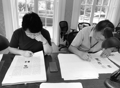 上海辭書出版社社長(zhǎng)秦志華(右)和副總編輯張敏審讀《辭?!罚ǖ谄甙妫┬?。