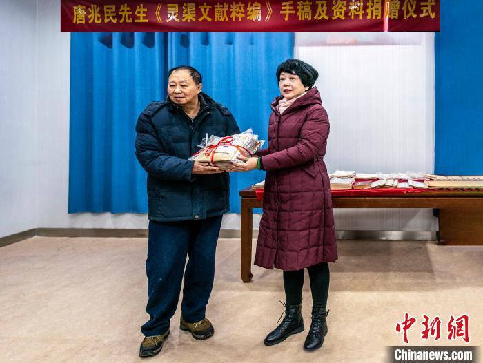 “卅載青燈知苦樂(lè),一篇黃卷薈磯珠。”捐贈(zèng)現(xiàn)場(chǎng),唐兆民兒子唐丁寧回憶其父親用四十年時(shí)間艱辛編撰《靈渠文獻(xiàn)粹編》出版后的感慨原話。