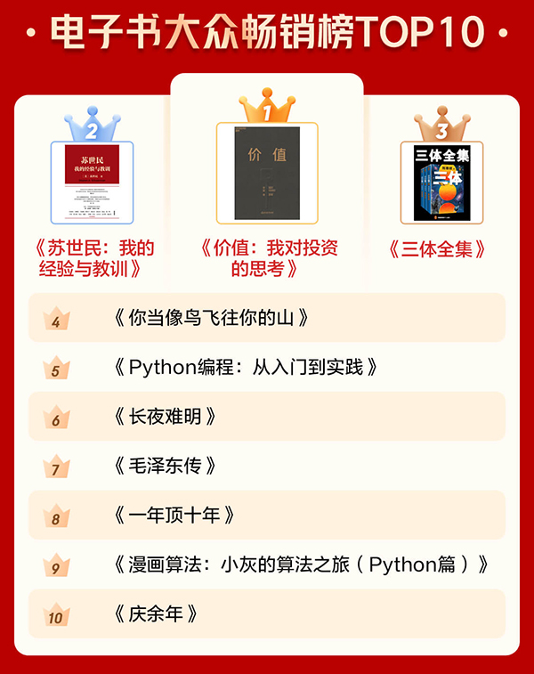通過電子書暢銷榜TOP10和有聲暢銷榜TOP10可以看出,很多人愈發(fā)關(guān)注投資和管理等方面的內(nèi)容,也愈發(fā)注重個(gè)人學(xué)習(xí)。《價(jià)值:我對(duì)投資的思考》《蘇世民:我的經(jīng)驗(yàn)與教訓(xùn)》 分別位居電子書暢銷榜第一名和第二名?!吨袊?jīng)濟(jì)2020》《原則》進(jìn)入有聲暢銷榜前十。此外,學(xué)習(xí)類圖書《Python編程:從入門到實(shí)踐》《漫畫算法:小灰的算法之旅(Python篇)》也上榜電子書暢銷榜前十。