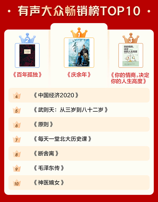 隨著大IP改編影視劇的熱度逐年升高,影視劇原著小說也越來越成為數(shù)字閱讀中最暢銷的書籍類型。其中,《慶余年》隨著電視劇的火爆和《慶余年2》原班人馬即將開拍帶來的熱議流量,其原著小說入圍電子書暢銷榜TOP10和有聲書暢銷榜TOP10;改編為《沉默的真相》的紫金陳原著小說《長(zhǎng)夜難明》則位列電子書暢銷榜第6名。
