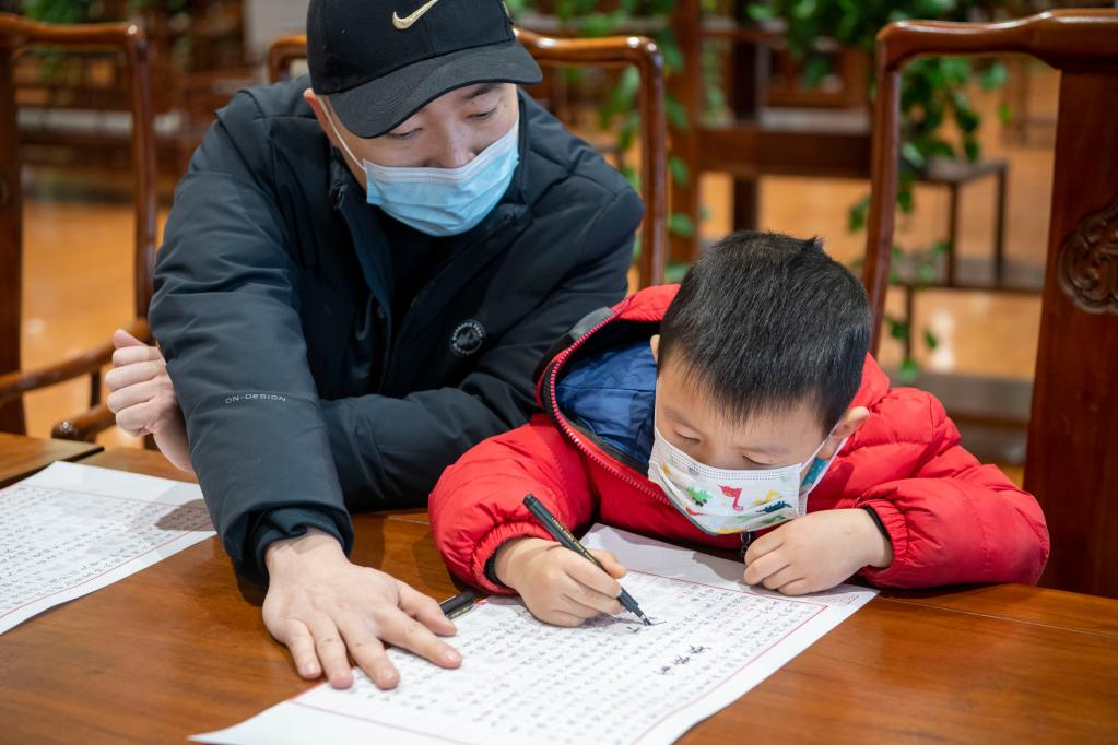 2月6日,小朋友和家長在太原市圖書館參加“觀四庫 抄經(jīng)典”活動(dòng)。