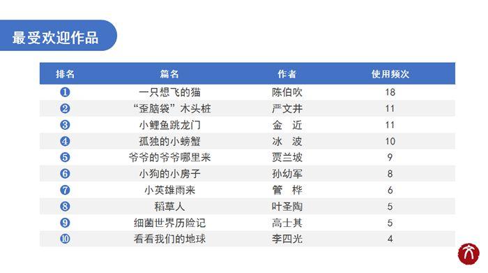 2021年度十大作品榜單為:《一只想飛的貓》(作者陳伯吹)、《“歪腦袋”木頭樁》(作者嚴(yán)文井)、《小鯉魚跳龍門》(作者金近)、《孤獨(dú)的小螃蟹》(作者冰波)、《爺爺?shù)臓敔斈睦飦怼?作者賈蘭坡)、《小狗的小房子》(作者孫幼軍)、《小英雄雨來》(作者管樺)、《稻草人》(作者葉圣陶)、《細(xì)菌世界歷險記》(作者高士其)、《看看我們的地球》(作者李四光)。
