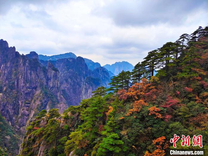 資料圖:黃山風(fēng)景區(qū)樹木色彩分層,紅黃相間。陳偉 攝
