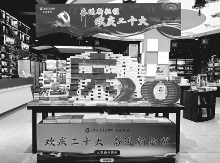 廣西新華書(shū)店集團(tuán)股份有限公司組織全區(qū)各連鎖門(mén)店先后開(kāi)展了“喜迎二十大 助力新發(fā)展”主題圖書(shū)展示展銷(xiāo)、“歡慶二十大 奮進(jìn)新征程”主題系列活動(dòng)。廣西新華書(shū)店集團(tuán)股份有限公司相關(guān)負(fù)責(zé)人介紹,全區(qū)門(mén)店近期開(kāi)展“歡慶二十大 奮進(jìn)新征程”主題門(mén)店美陳大賽,通過(guò)精選出111個(gè)全國(guó)近期出版的主題圖書(shū)品種進(jìn)行重點(diǎn)展示,配套主題海報(bào)、背景板,以各門(mén)店融合當(dāng)?shù)靥厣拇a堆造型進(jìn)行整體美陳,向廣大讀者推薦一批導(dǎo)向正確、質(zhì)量上乘的優(yōu)秀主題圖書(shū)。
