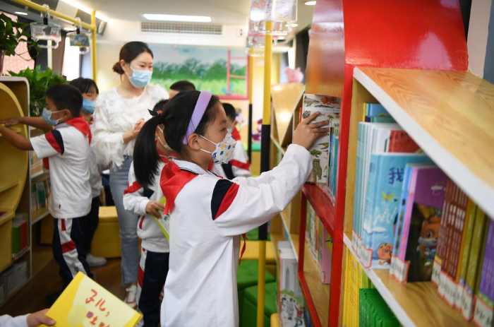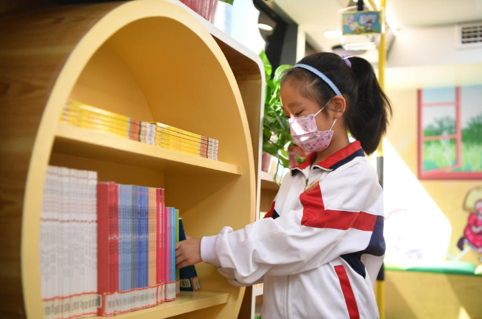 11月10日,學(xué)生在長(zhǎng)沙市青園友誼小學(xué)巴士圖書館內(nèi)閱讀。