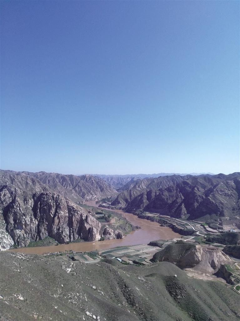 向西鳥瞰黃河,黃河幾乎直線撲面而來,河水發(fā)黃,流淌緩慢。過去這里,河水湍急,老遠(yuǎn)就能聽到咆哮之聲。由于20世紀(jì)末,在下游20公里處建了小峽水庫(kù),河水被抬升,河水流緩。黃河北面,依然是光禿禿的山巒。低頭看腳下的黃河,南岸的漢長(zhǎng)城遺址清晰可見,旁邊有二三個(gè)人在農(nóng)田勞作。黃河流到此處,被腳下的九圪垯山迎面阻擋,折而向北,切開重重山巒,帶著野性,蜿蜒而去,一點(diǎn)兒也不留戀桑園子峽,不留戀九圪垯山,不留戀滄桑的大地和歲月。