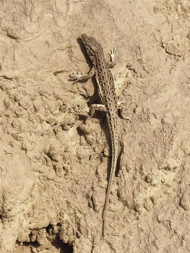 即將到達(dá)山頂,腳底下發(fā)現(xiàn)了亂竄的小蜥蜴。這是當(dāng)?shù)爻R姷囊环N小蜥蜴,就是壁虎,當(dāng)?shù)厝朔Q為蝎虎子、七寸子。土皮色,半厘米粗,5至10厘米長(zhǎng),跑的很快,有很強(qiáng)的自我保護(hù)意識(shí)。若被人或獵食者抓住尾巴,會(huì)主動(dòng)斷掉尾巴逃跑,后在不到一個(gè)月的時(shí)間內(nèi),長(zhǎng)出新尾巴。盡管有此本領(lǐng),但往往還是鷹和烏鴉等食肉飛禽及蛇的獵物。