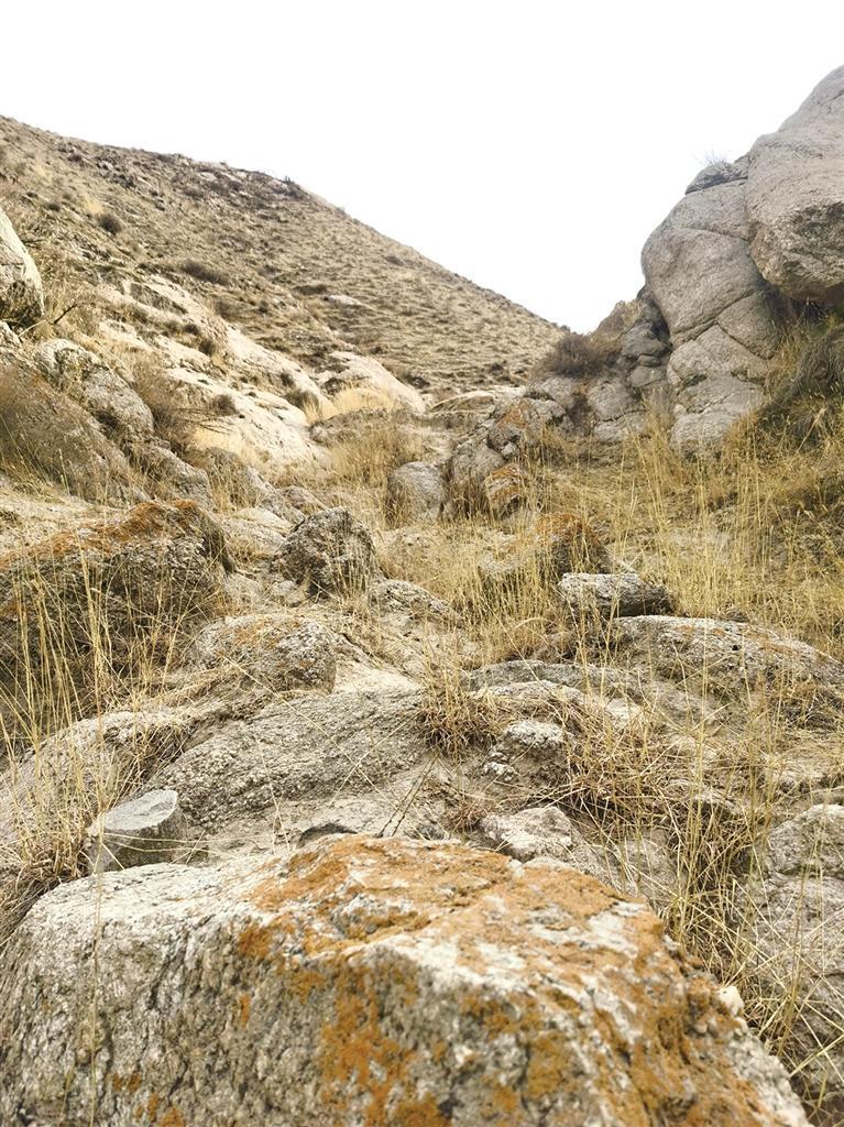 東坪向東300米,就是榆中境內(nèi)唯一遺留的一處漢長(zhǎng)城遺址,該遺址現(xiàn)只有一處墻墩,緊鄰黃河,圍長(zhǎng)40 余米,高約5米,無任何防護(hù)措施,墻壁上,有磚、石混雜其中,人工夯筑之痕清晰可辨。西側(cè)墻面上,還有人掏挖的小窯洞。高1.3米,深達(dá)50厘米。破壞嚴(yán)重。漢長(zhǎng)城遺址再向東200米,東金公路向右拐入七峴溝,向來紫堡川而去,而黃河則被東面的大山阻擋,無路可去,左拐北折而流向什川。此處就是著名的黃河大“幾”字灣的第一灣。第一灣的南岸,有十來戶人家,地名叫駱圈灣。由于地處古絲綢之路,曾建有駱駝圈和小型客棧供駱駝客隊(duì)歇腳而又在黃河拐彎處而得名,后來,因諧音,叫羅泉灣。山腳下,有七八棵楊柳已吐綠。沿黃河,已無路可尋,就沿洪水沖的山溝上東山,還是無路,甚至沒有羊腸小道,巖石裸露,怪石嶙峋,坡陡難行。巖石層只有七八十米厚。此山的石頭,含有石英成分,石質(zhì)軟,無開采利用價(jià)值。再往上,就是黃土層,直到山頂。由于干旱,整個(gè)山上,無一棵樹木,甚至連灌木都沒有。耐堿耐旱的駱駝蓬只發(fā)出二厘米的枝蔓,一些蒿草和矮草,也剛發(fā)芽,還有一些匍匐在地面的無名小草,卻已開出了扁豆大小的艷麗的小花,有白色的和淡藍(lán)色的蝴蝶飛起飛落。爬到半山腰,太陽(yáng)已全面照曬,山坡雖陡峭,卻無陰涼可乘。渾身發(fā)熱,不得不解開衣扣,緩慢前行。